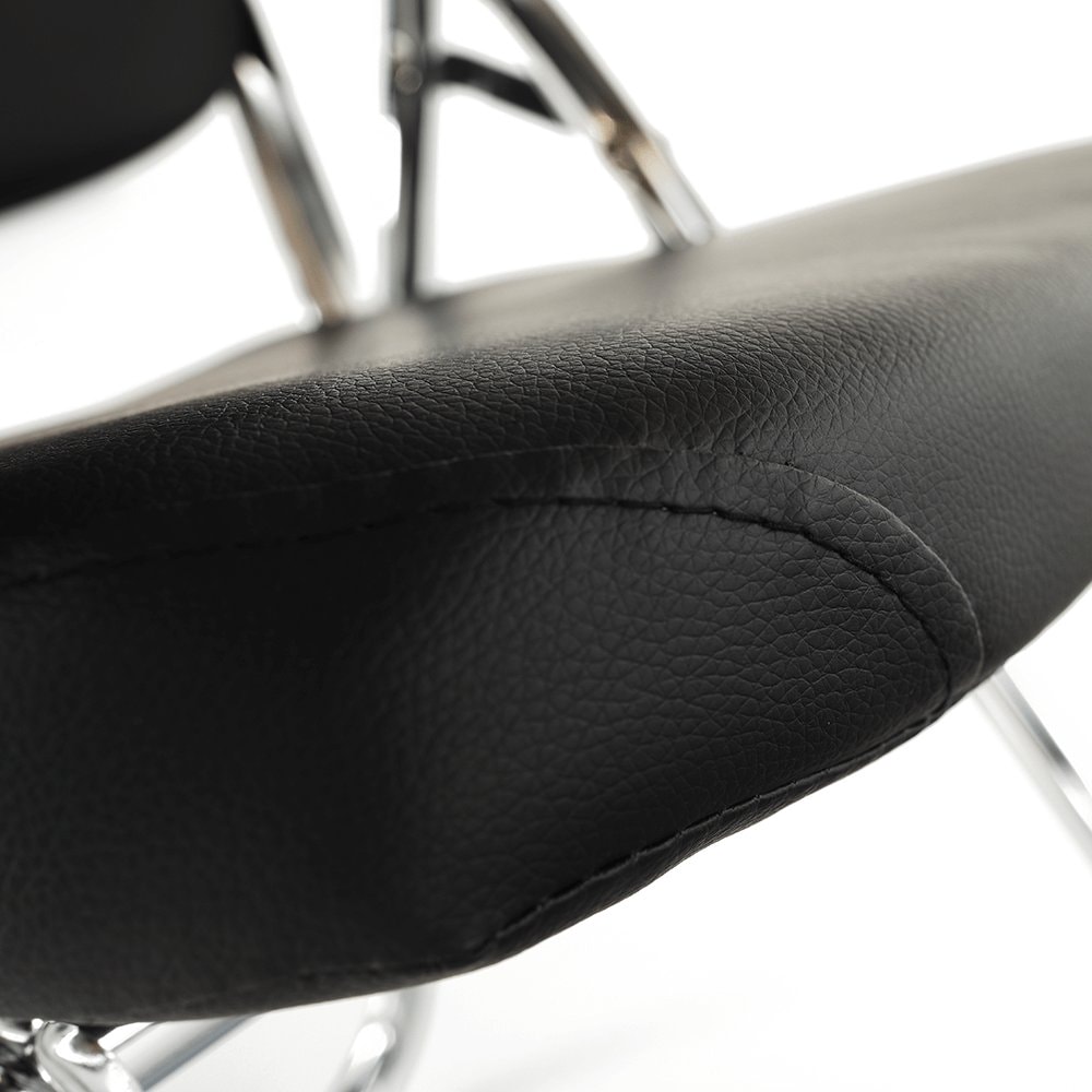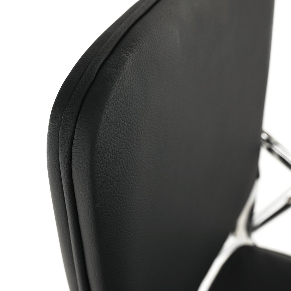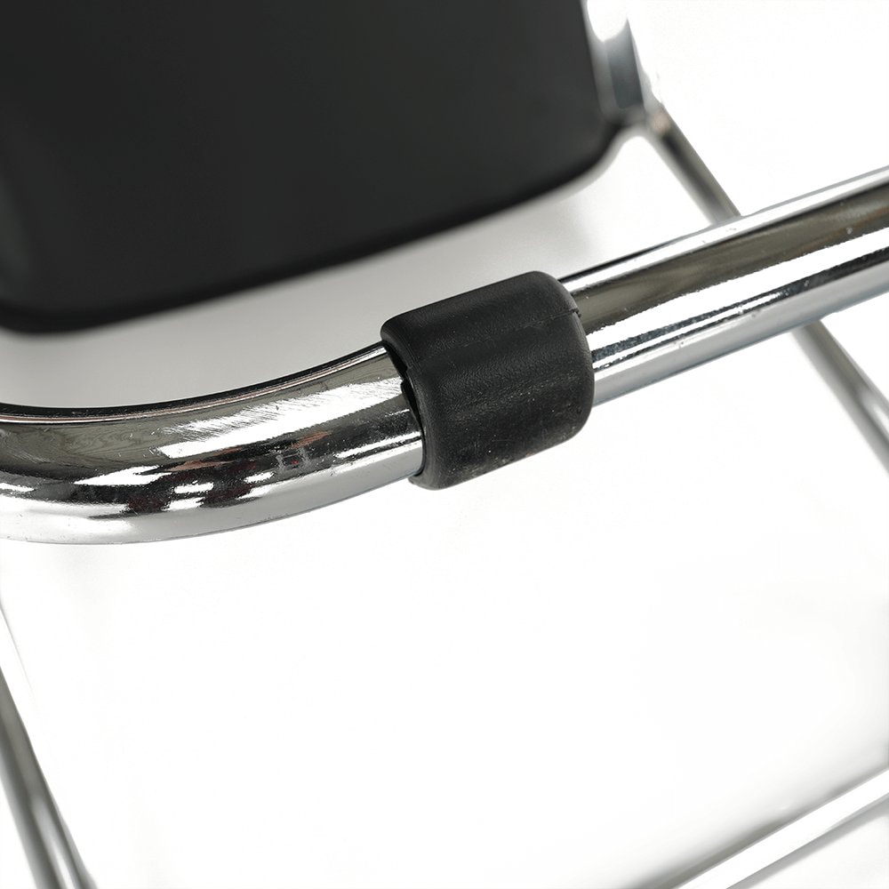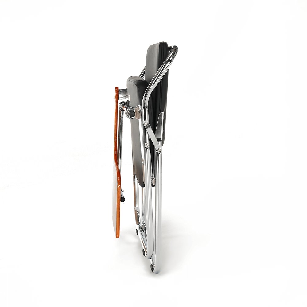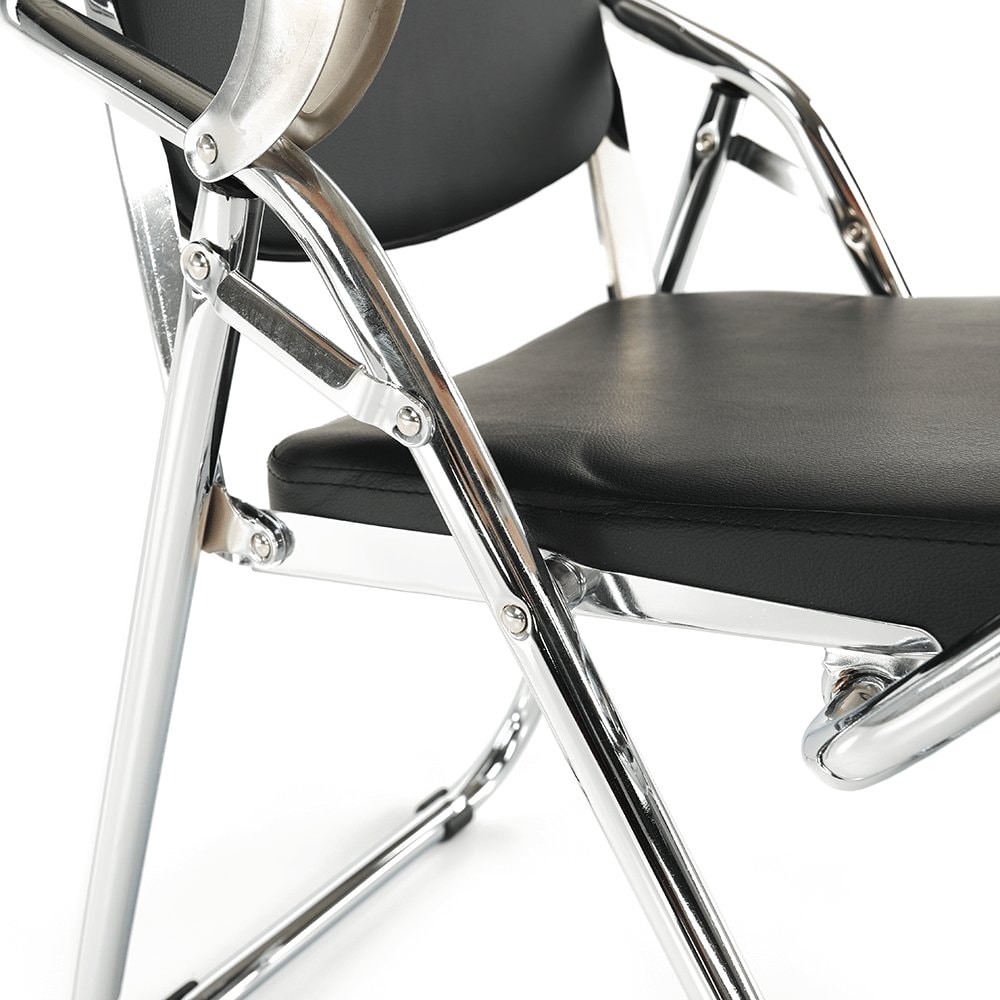 Pokud židle zrovna není nutná, snadno ji složíte a uložíte do rohu místnosti. Sedací část spolu s opěrkou zad jsou čalouněné kvalitní černou ekokůží, kterou elegantně doplňují chromové nohy. Celkový design židle dotváří praktický stůl v přírodní barvě.