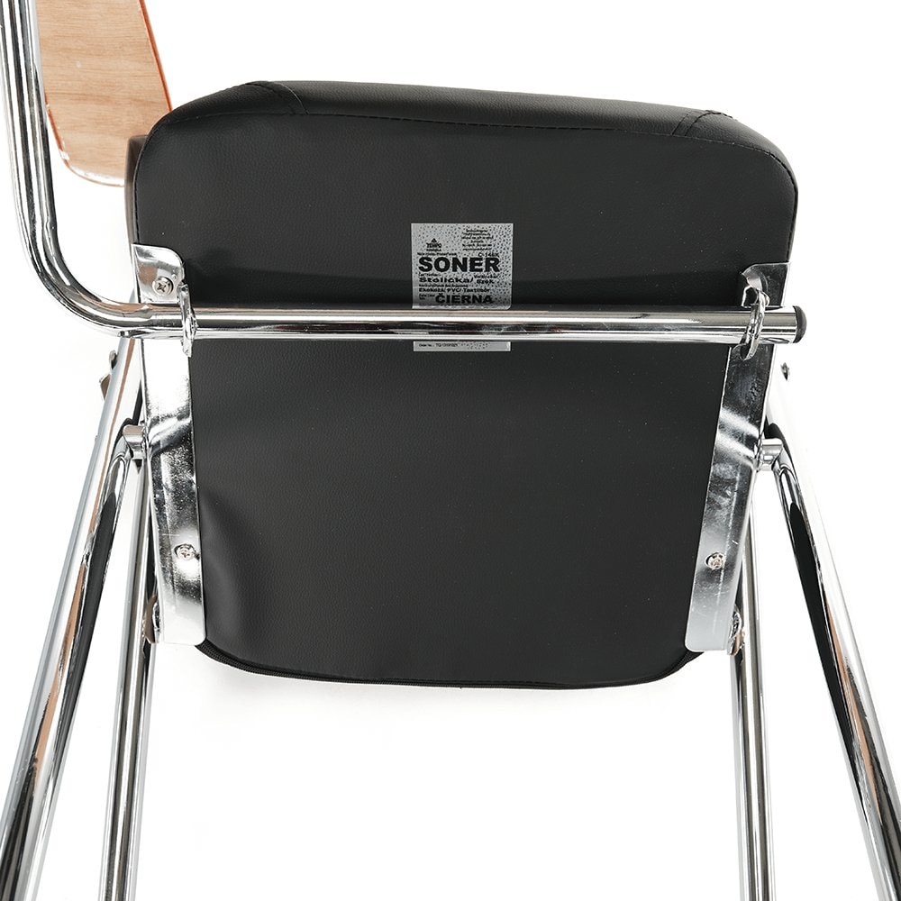 Zasedací židle s deskou na psaní SONER Materiál: ekokůže / dřevo / kov Oděruodolnost textilie podle testu Martindale: 100 000 oděrek Barva: černá / přírodní / chrom Rozměry (ŠxHxV): 51x85x84 cm Šířka sedu: 39 cm Výška sedu: 42 cm Hloubka sedu: 40 cm Zádová opěrka (ŠxV): 37x46,5 cm Rozměry desky …