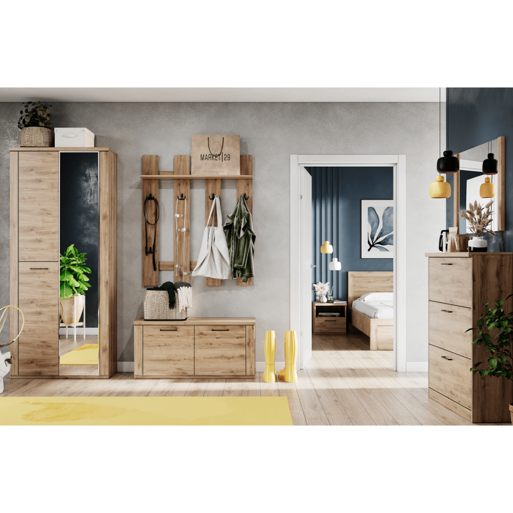 Sektorový nábytek z kolekce DORSI okouzlí nejednoho návštěvníka vaší domácnosti. Přichází se spoustou komponentu, se kterými zařídíte nejen obývací pokoj, ale vkusně dotvoříte prostor ve vaší jídelně, ložnici, studentském pokoji, kanceláři nebo předsíni. DORSI je vyroben z laminované dřevotřísky, korpus je MDF. Originální je barevným provedením dub navarra, který mu přidává na eleganci. Při manipulaci s nábytkem vám pomohou praktické černé plastové úchytky.