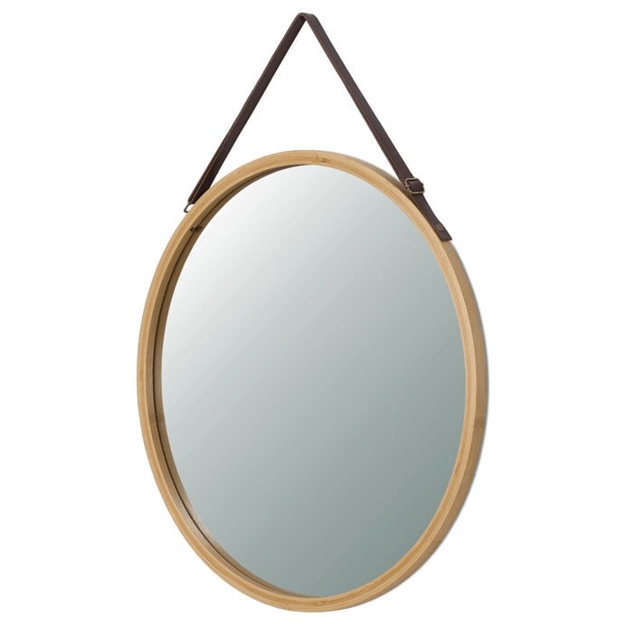 Kulaté nástěnné zrcadlo o průměru 45 cm je vyrobeno z masivního bambusu v přírodním odstínu, který dodává prostoru příjemnou a teplou atmosféru. Rám z bambusu je hladce opracovaný a zvýrazňuje přirozenou kresbu dřeva, zatímco kvalitní skleněná deska zajišťuje čistý a jasný odraz. Zrcadlo je zavěšeno na tmavém koženém pásku s dřevěným úchytem, což umožňuje snadnou instalaci a zároveň přidává dekorativní prvek. Je vhodné pro umístění v předsíních, koupelnách i obývacích pokojích, kde podtrhne přírodní styl interiéru.